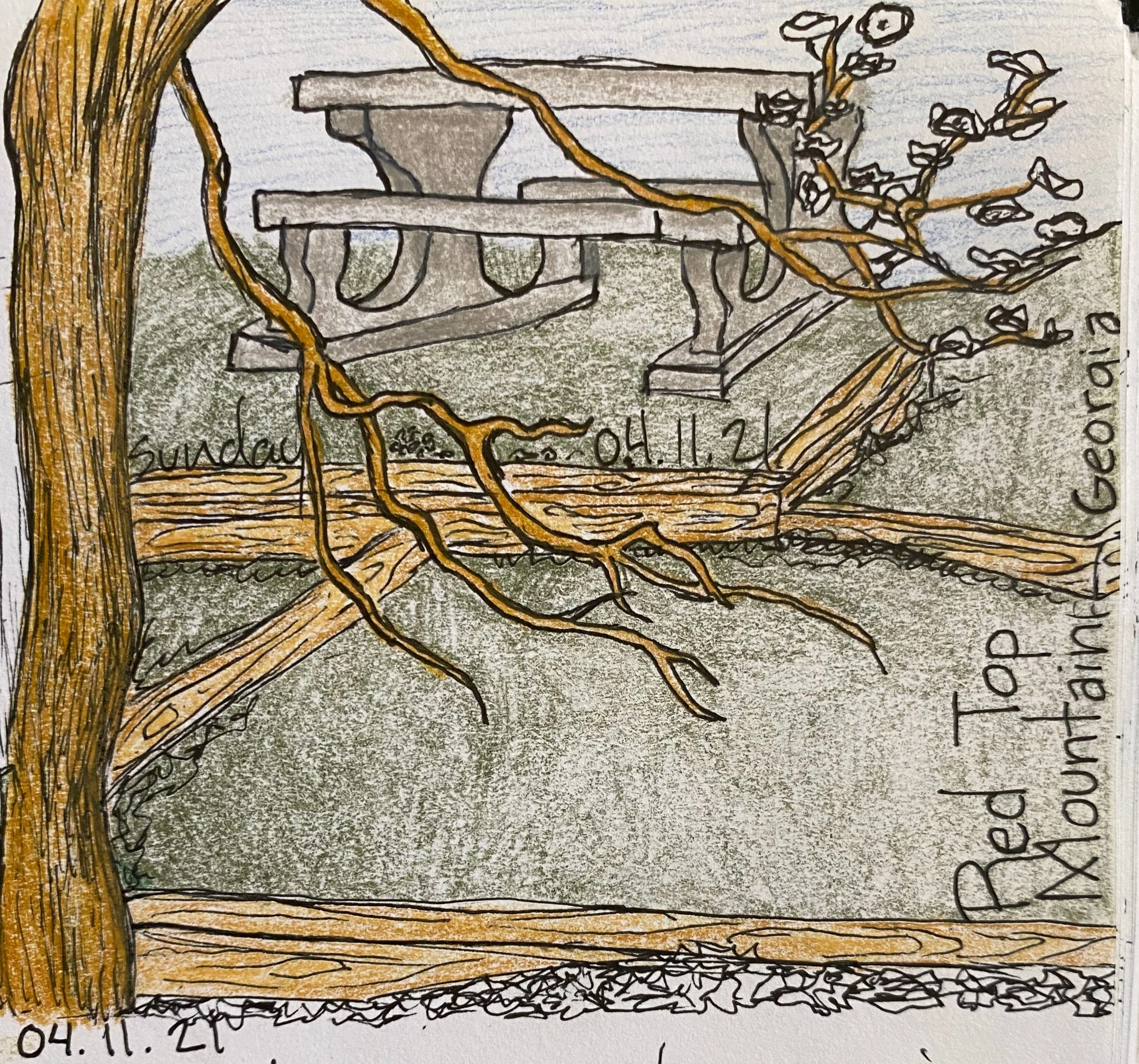 The image above is Aubin Elise’s drawing of Red Top Mountain State Park in Georgia. She kept a journal with drawing of each place we visited on our south/central/western USA trip in 2021.
