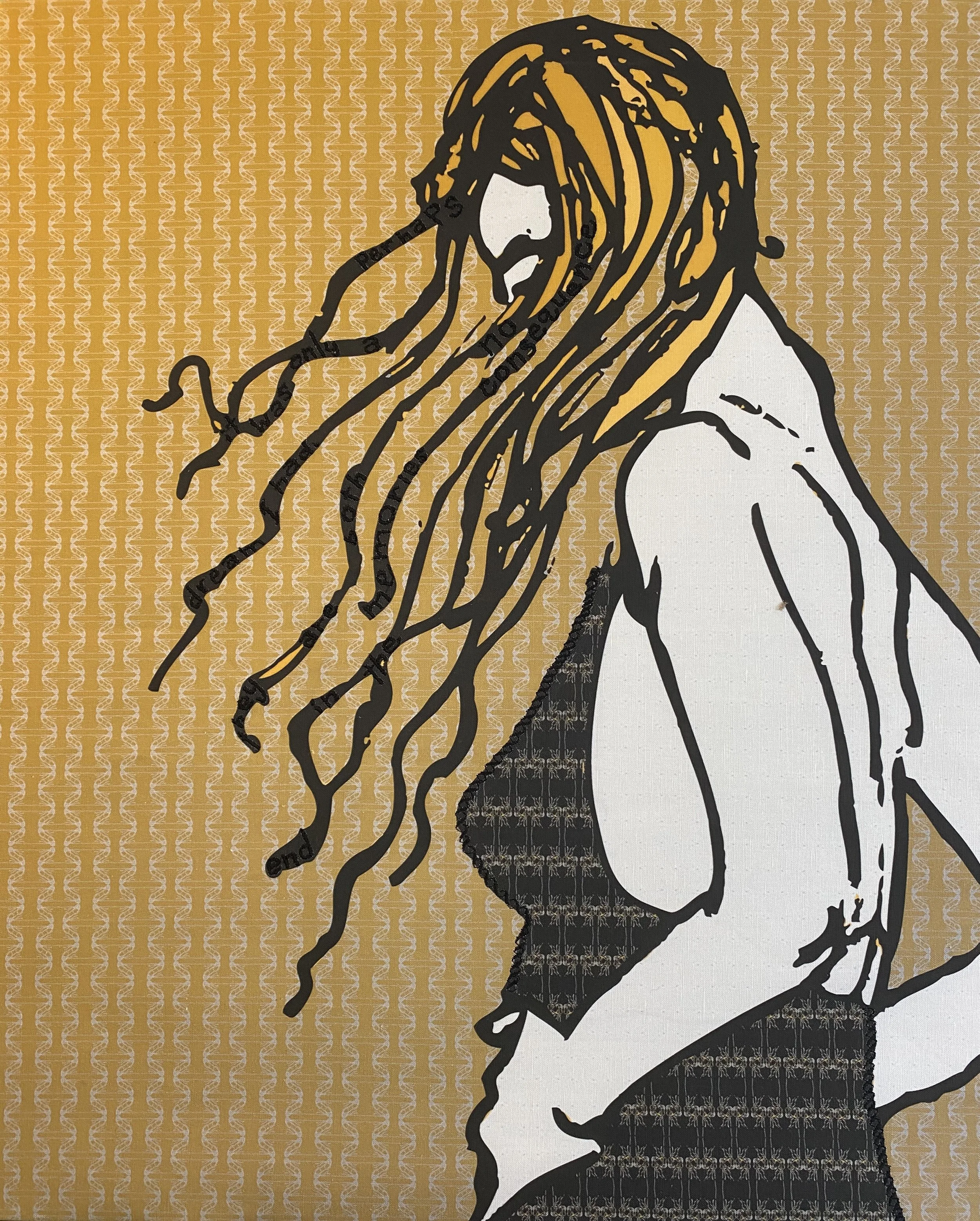 I See Your Beauty 1/2 - Drawing circa 2000, abstracted a motif and created a series of patterns, each filling an area of the print. Machine embroidered poem in hair.